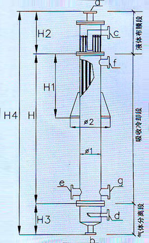 布膜器垂直地沿列管内碧以薄膜状下将,气体自上而下(并流)或自下而上(逆流)通过内管空间,气液两相在流动的液膜上进行传质反应。列管外通冷却水(剂)以除去吸收过程中释放出的热量。由于它许多性能超过石墨降膜吸收器,因些它已广泛代替石墨降膜吸收器。